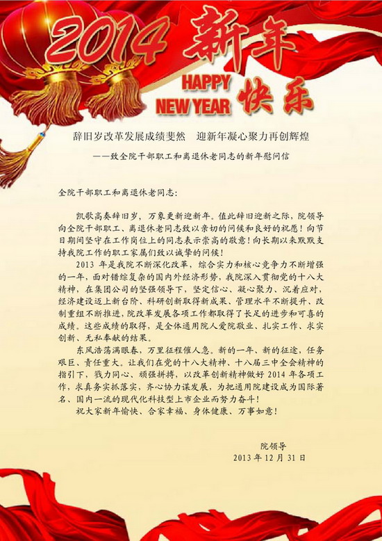 辭舊歲改革發展成績斐然 迎新年凝心聚力再創輝煌――致全院干部職工和離退休老同志的新年慰問信