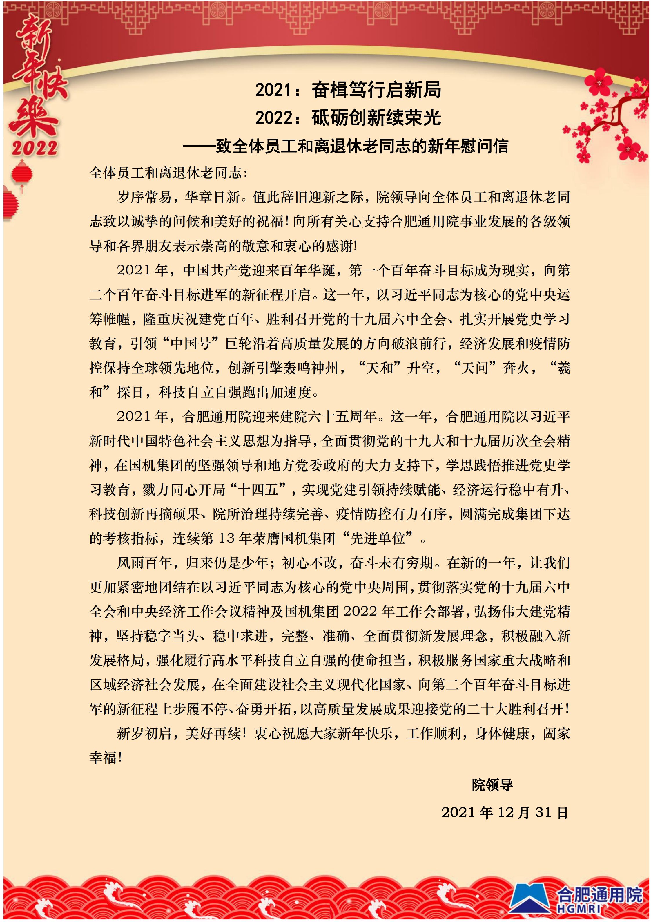 2021:奮楫篤行啟新局 2022:砥礪創新續榮光——致全體員工和離退休老同志的新年慰問信